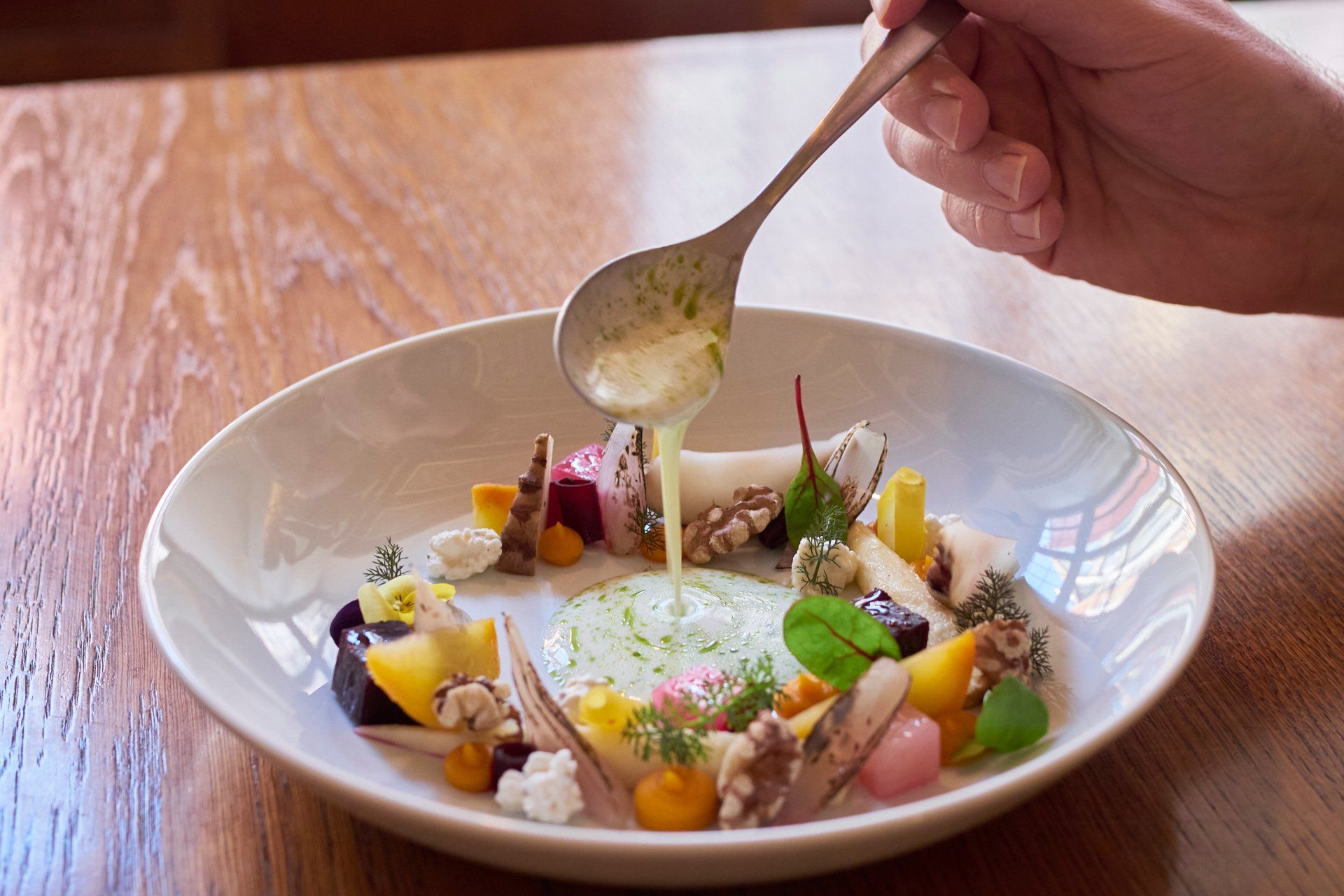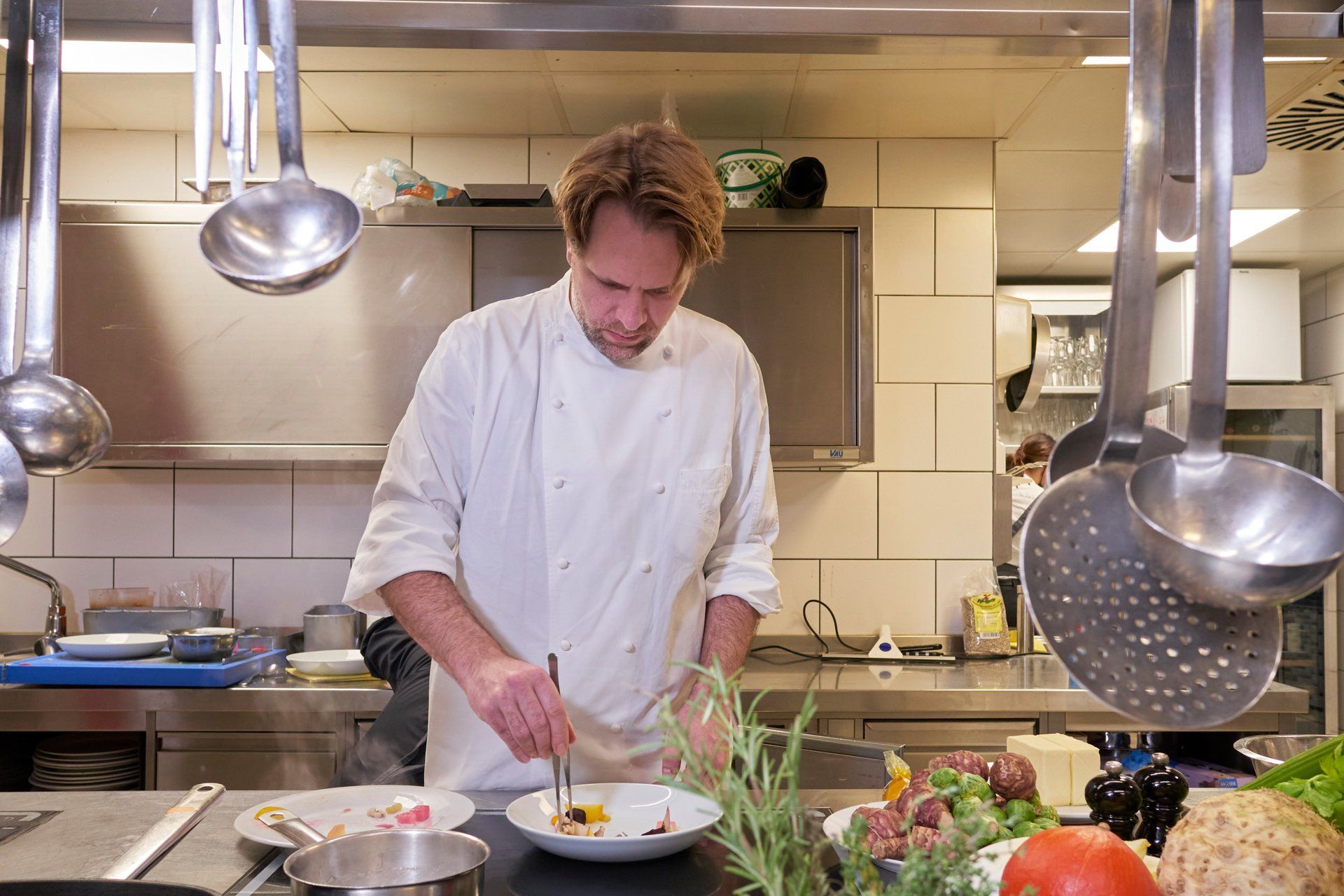 Die Inspiration für seine neue vegetarische Vorspeise? »Die Jahreszeit, Ausrufezeichen.« Die Frage sei, was er saisonal bekommen und mit welchen Zutaten er seine Gäste abholen kann. Vegetarisch, saisonal und regional zugleich zu kochen bedeutet, ein Rezept um das herum zu entwickeln, was es gerade gibt. Wie früher.