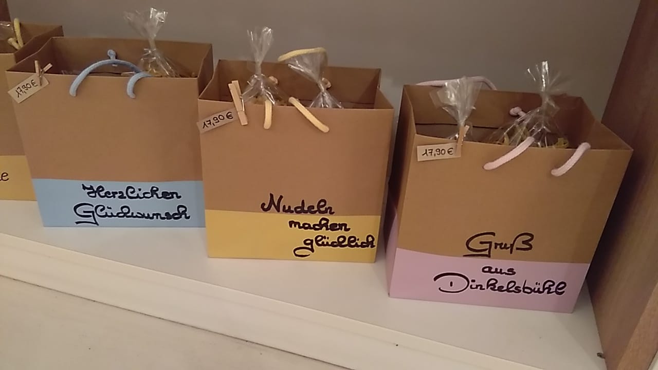 Beliebt sind auch die individuell gestalteten Nudeltüten von der Nudelmanufaktur: Man sucht sich Nudeln aus, dazu eine Soße, Gewürze, ein feines Öl – und die kreative Inhaberin schreibt eine passende Botschaft auf die geschmackvolle Geschenktüte. Zu ihren treuen Dinkelsbühler Stammkunden gesellen sich Kunden aus den Nachbarorten, gelegentlich bis aus Ansbach oder Schwäbisch Hall, und Tagestouristen.