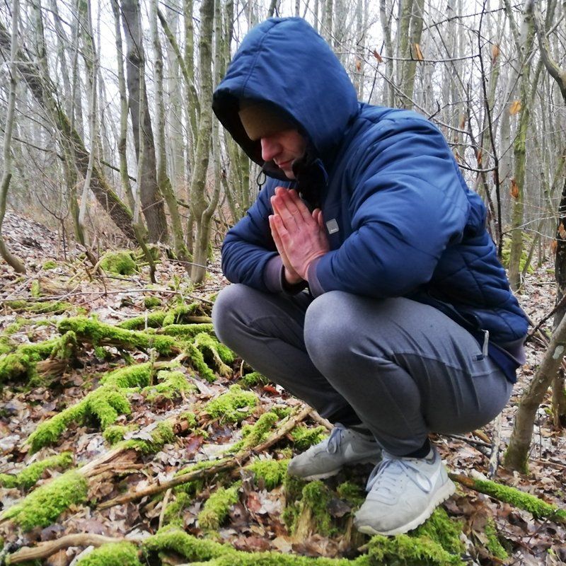 An einer Gabelung halten wir inne. Jan-Eric Kaiser, bei dem ich in Dinkelsbühl seit zwei Jahren Yoga praktiziere, bringt die Gruppe in die erste Yin-Yoga-pose, eine tiefe Hocke. »Beim Yin-Yoga lernt man eine wichtige Voraussetzung für das Loslassen: das Nicht-Bewerten«, sagt der Yogalehrer. »Erst wenn du dich so akzeptierst, wie du bist, kannst du loslassen und hast damit die Chance auf Veränderung.«